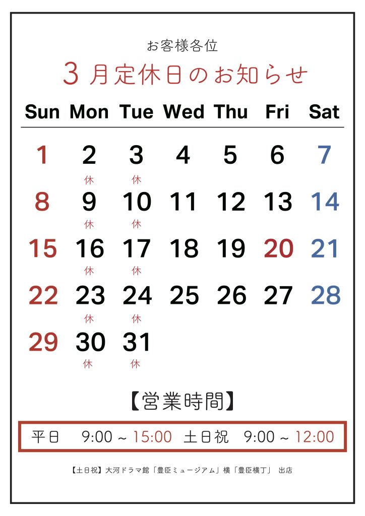 Home MASA daily 3月定休日のご案内 3月定休日のご案内 2026.02.27 MASA daily いつもご利用いただきありがとうございます! 土日祝はモーニングのみの営業となりますのでご注意ください。 ご迷惑をおかけいたしますがよろしくお願いいたします。